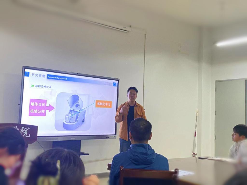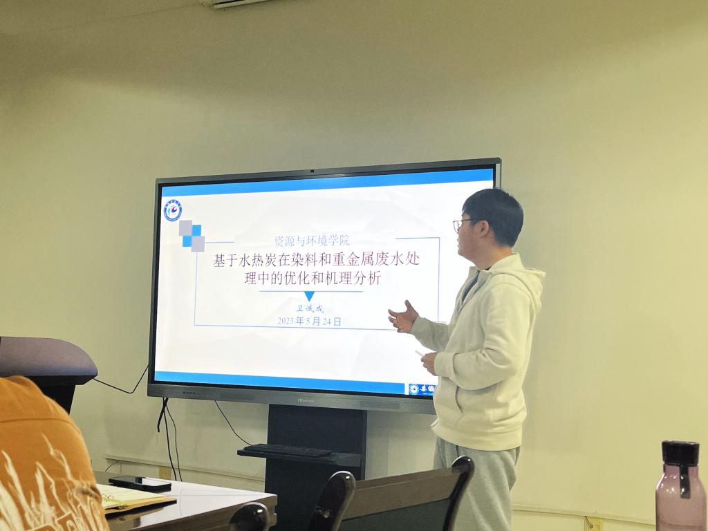 卫诚成同学以《基于水热炭在染料和重金属废水处理中的优化和机理分析》为题,从试验材料、试验方法、试验结果、讨论分析等方面分享了自己在具体科研试验过程中的经验。江飞同学以《球磨改性生物炭对水体中MBCr(VI)吸附效果的研究》为题,为同学们分享了从课题选题、进行试验、作图、分析数据到论文投稿等方面分享了自己的经验,并介绍了碳基功能材料在实际应用中的前景。