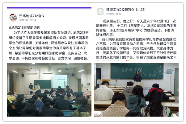 12月,随着各类助学金的发放,新生班级结合班级实际开展资助育人专题宣讲活动,活动由资助委员主持。活动中,2021级农业资源与环境专业总结前期工作,资助委员对学生资助政策进行详细培训;2021级环境工程专业以“净化”为主题开展校园实践活动,组织受助学生进行校园清扫活动;2021级地理信息科学专业召开资助育人主题班会,强调资助资金使用注意事项,引导学生常怀感恩之心,充分利用资助资金提升学习,以实际行动回馈集体。