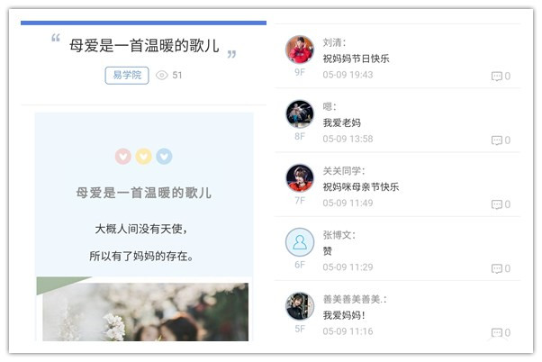 5月9日母亲节,学院积极组织学生参加学校“书写感恩,铭记感恩”特别活动,活动现场秩序井然,热情高涨,同学们希望将最美好的祝福送给母亲。同时,学院易班工作站撰写网络推文——“母爱是一首温暖的歌儿”,同学们积极在评论区留言,抒发对母亲的感恩之情。活动用语言描绘伟大的母爱,用文字记录感恩的心。