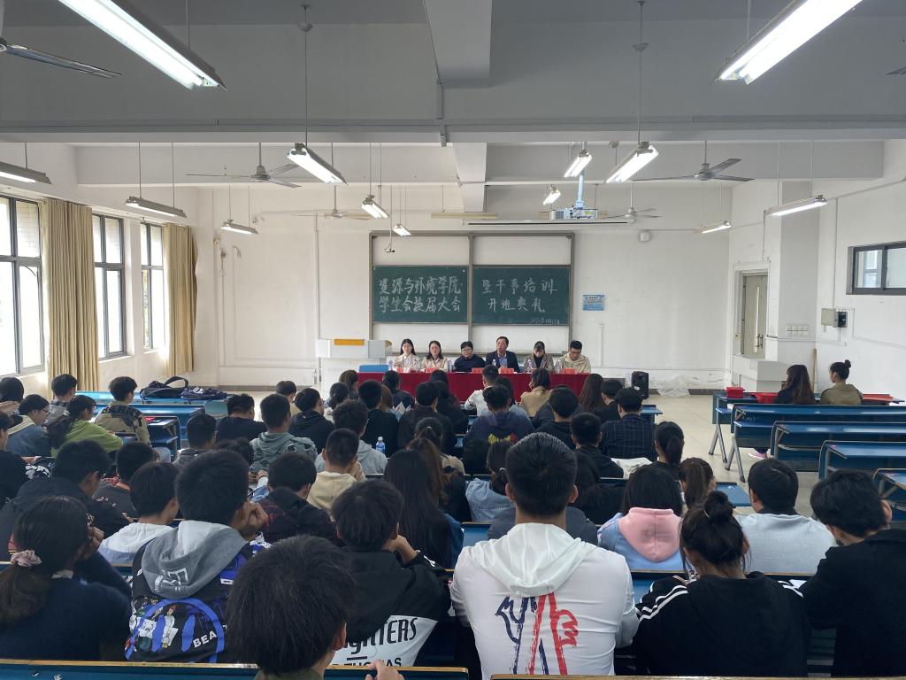 王丽萍宣读第六届学生会全体成员名单。第五届学生会主席吴柳莹、第六届学生会执行主席陈汉分别代表发言。谢宜勤、吴国良、王丽萍分别为第五届学生会主席团、部长级成员颁发聘书并合影留念。