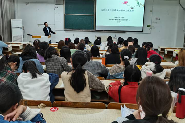 10月22日,河南大学文学院王银辉副教授应人文学院邀请,在求知楼A207教室举办“当代大学生应具备的基本文化素养”主题讲座。讲座由人文学院中文系副主任和建伟主持,汉语言文学专业2018、2019级学生聆听讲座,并与王银辉进行了现场交流。