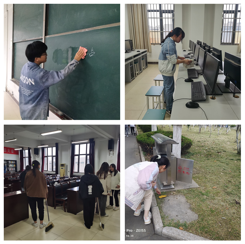 在集体劳动实践活动中,汉语言专业同学负责卫生区打扫,法学专业同学负责实验室、模拟法庭、自习室的大扫除,人文学院青年志愿者协会负责检查监督,活动区域分工明确,经过大家的努力,卫生区做到了无落叶杂草、无污渍积水、无废土石块、无纸屑烟头等垃圾废弃物,实验室、模拟法庭、自习室窗明几净、一尘不染。