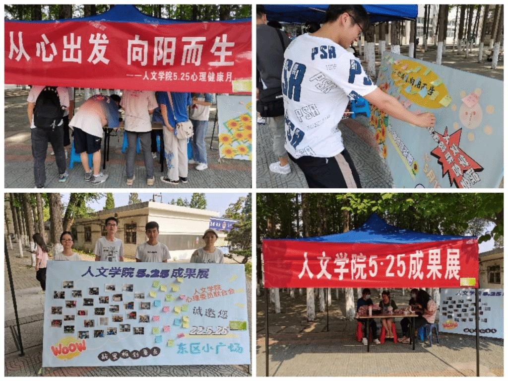5月25日,人文学院“5•25心理健康月成果展”在东区小广场举行,展板上丰富多彩的照片展示了人文学院心理健康月系列活动的成果,见证了人文学院心联成员的付出与努力。本次活动的圆满举办,创新了心理健康教育形式,普及了心理健康知识,在全校营造了关注心理健康、懂得心理健康、重视心理健康的浓厚氛围。(特约通讯员:鲁冰冰 审核:李沙娜)