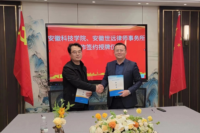 李晓东代表学院与安徽世远律师事务签署实习实训基地协议,牛永辉向安徽世远律师事务所授予“半岛在线客服实习实训基地”牌匾。(特约通讯员:高晓宁 摄影:高晓宁 审核:牛永辉)