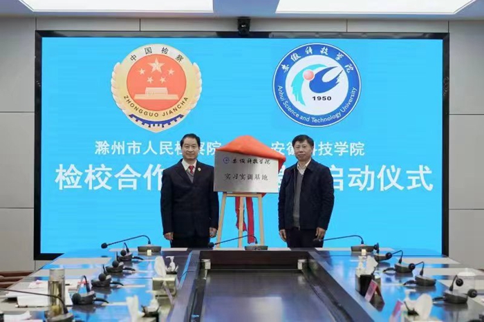 11月28日下午,校党委书记时伟赴滁州市人民检察院,出席校检合作签约暨实习实训基地揭牌仪式。校党委(校长、法治)办公室主任卢星辰,人文学院党委副书记、副院长李晓东,法学系教授宣刚;滁州市人民检察院党组书记、检察长李玉科,副检察长高潮,检委会专职委员喻尊晏,第七检察部主任王昌杰,办公室主任毕西先等出席仪式。