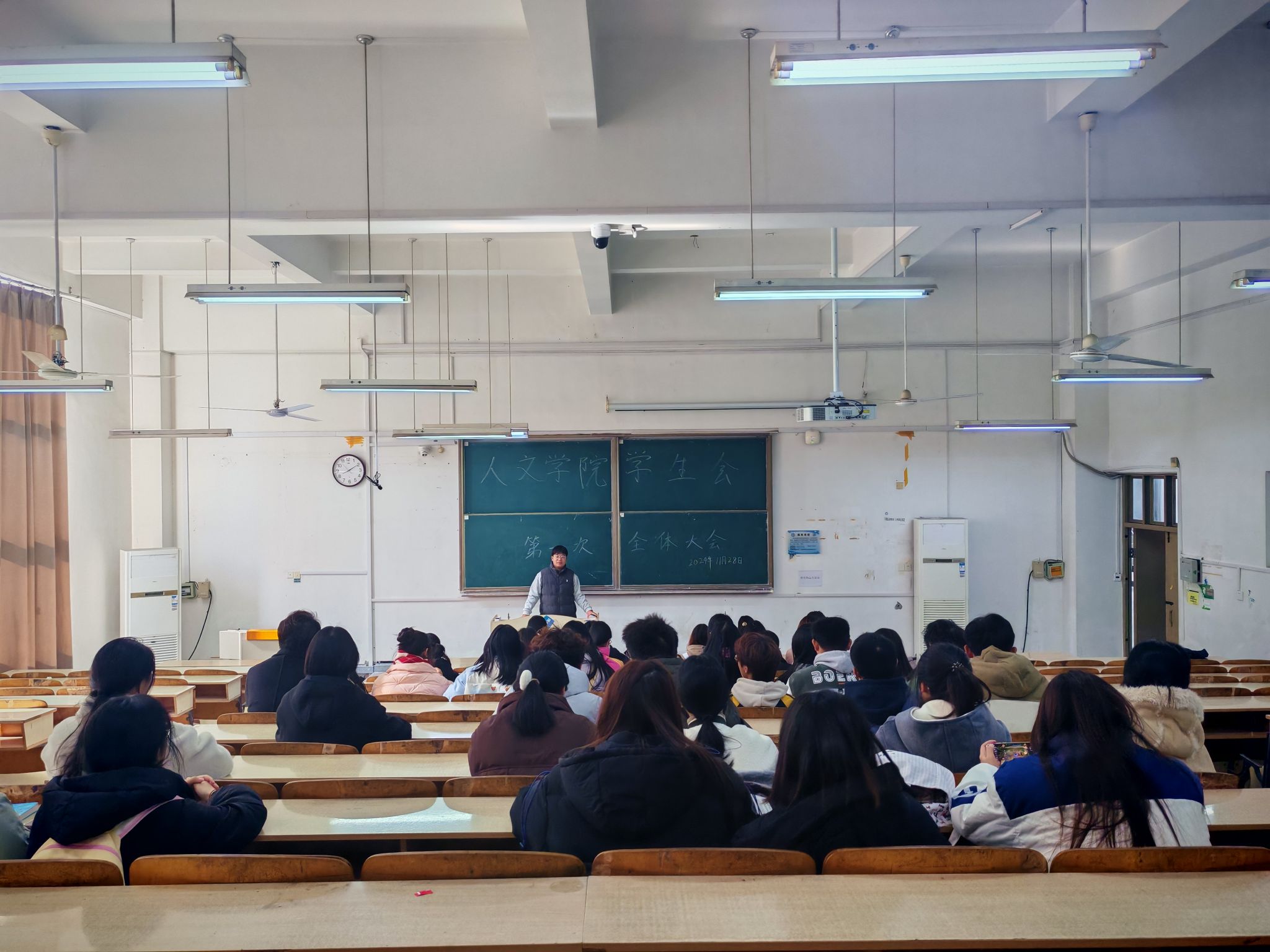 为切实加强学生干部队伍建设,改进学生会管理,强化服务功能,进一步提高学生会全体工作人员思想素质和工作能力,充分发挥他们在学生与老师之间的桥梁纽带作用,12月4日中午,人文学院第十四届学生会在求知楼A206召开第一次全体大会。学生会全体工作人员参加,会议由主席团成员王家喜主持。