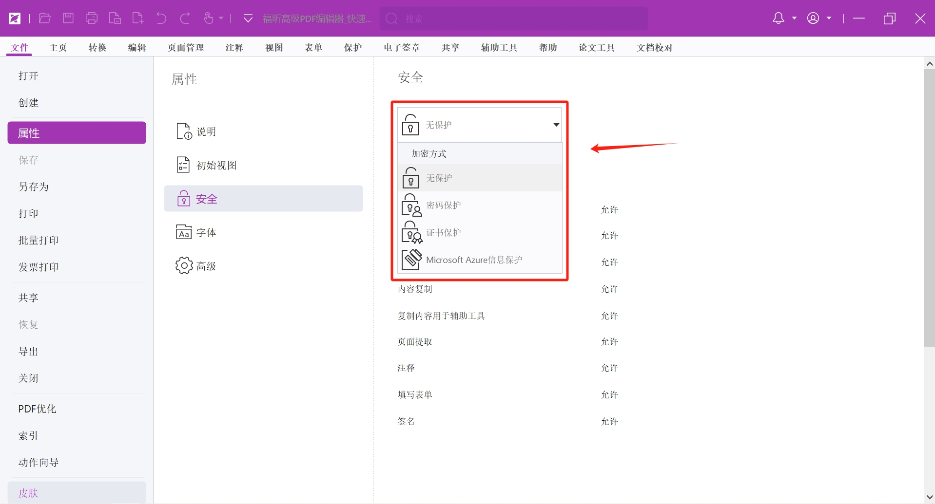 我们利用福昕高级PDF编辑器打开一份文档,点击左上角【文件】>【属性】>【安全】,这时就可以在右侧看到权限情况。如下图,该文档是无密码保护的。