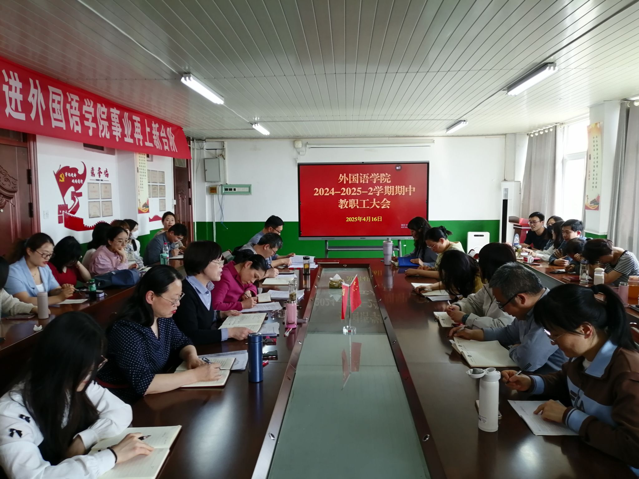 4月16日下午,外国语学院在学知楼五楼会议室召开2024-2025学年第二学期期中全体教职工大会。学院党政领导与全体教职工参加会议,会议由院长刘萍主持。