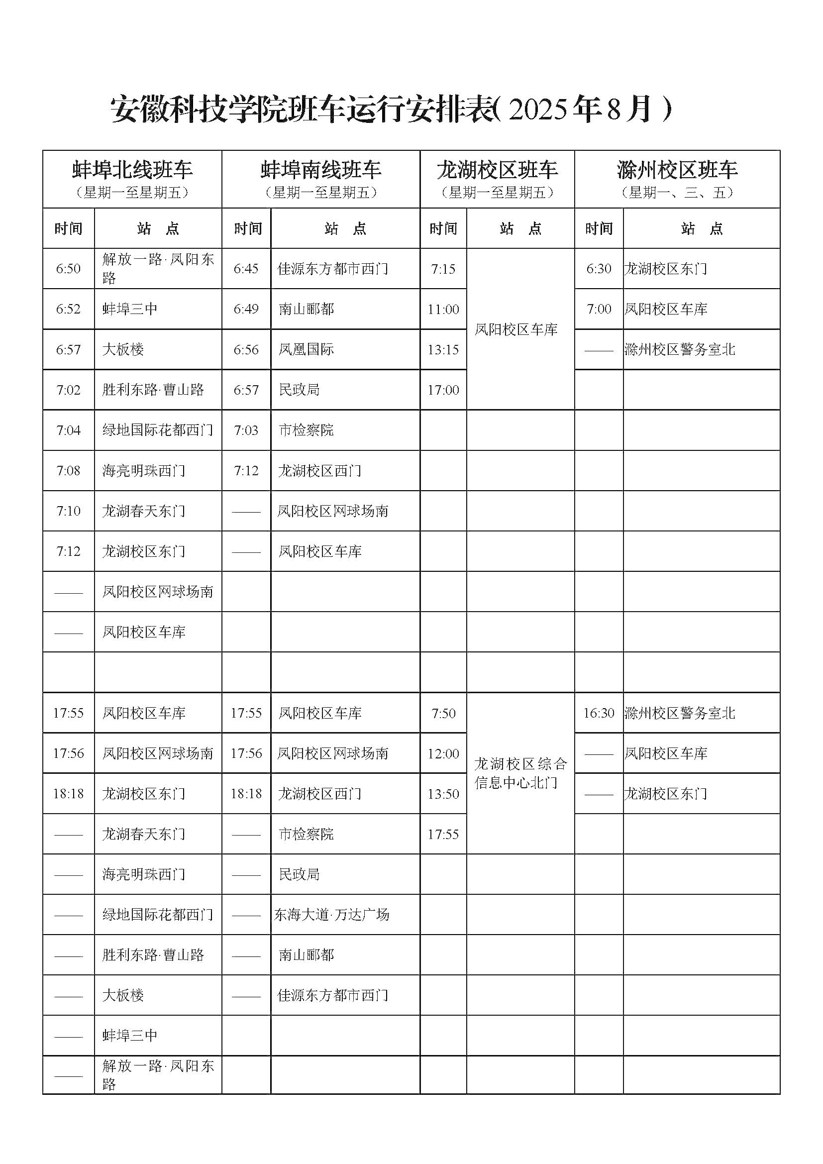(二)滁州校区班车各站点按《半岛在线客服班车运行安排表(2025年8月)》早晚各推迟30分钟发车;