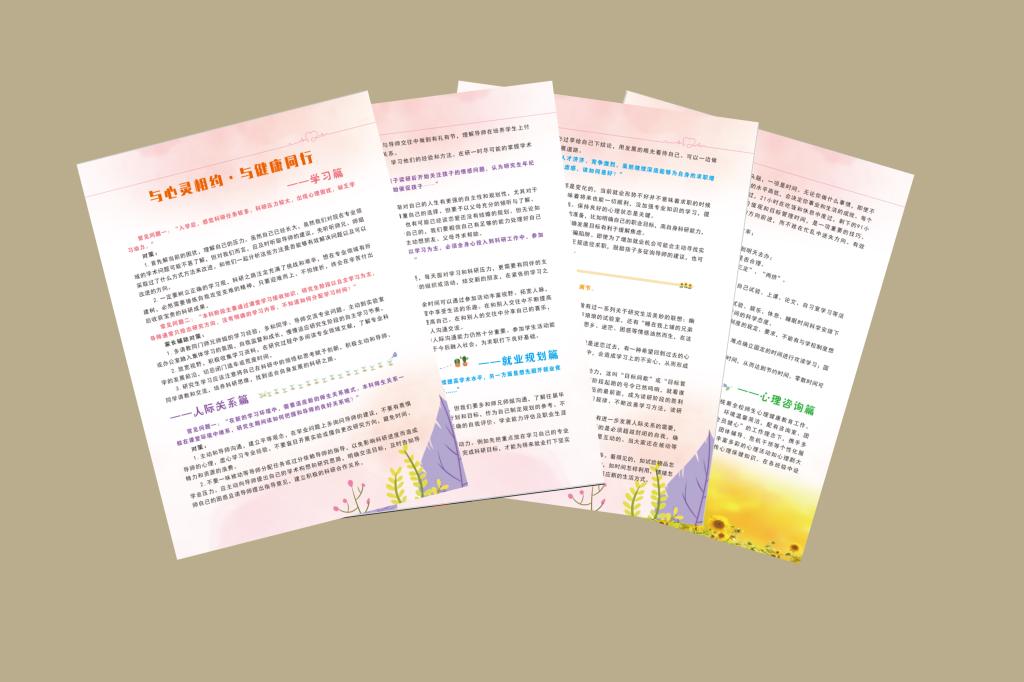 编制一份手册,让心理健康知识成为手边书。通过大量的意见调查与意向收集,半岛在线客服研究生会广泛与研究生同学沟通交流,梳理总结了研究生普遍关心关注的心理健康方面的问题,编制了学习篇、人际关系篇、就业规划篇、自我调节篇、心理咨询篇5个篇章的《研究生心理健康宣传手册》,并发放至全校400余名研究生,让心理健康常识真正成为广大研究生“挥手即来”的手边书,时刻提供帮助和参考。