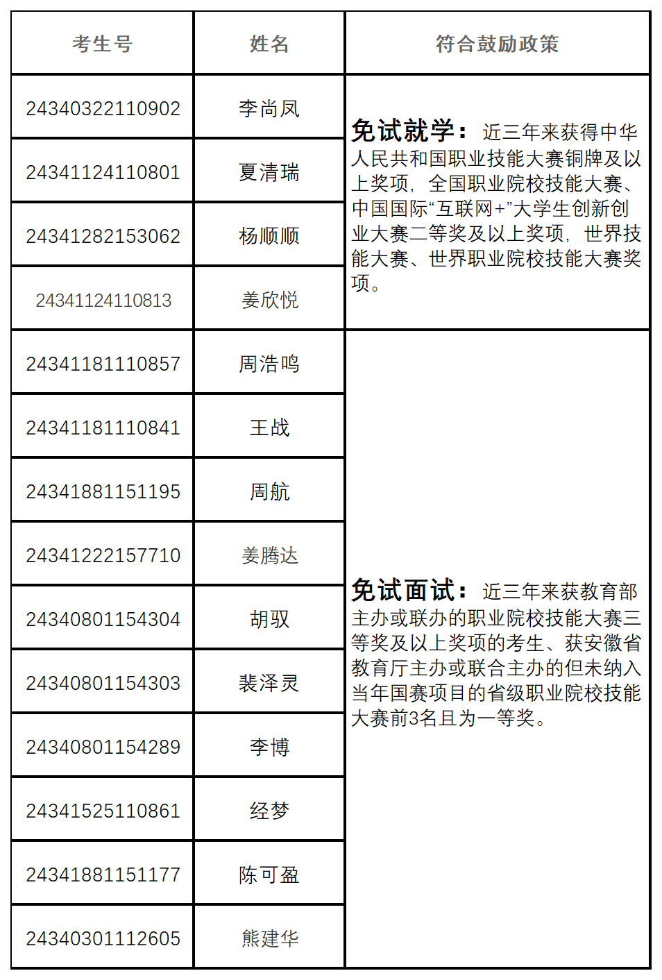 根据《半岛在线客服2024年面向中职毕业生对口招生章程》关于申请免试就学、免试面试和加分鼓励政策的相关要求,经考生申请,学校审核,共有李尚凤等4名考生符合免试就学政策,周浩鸣等10名考生符合技能大赛免试面试政策,无符合考试加分政策考生,现对符合相关鼓励政策的考生信息予以公布。免试就学资格复审和免试面试具体安排见通知公告栏“半岛在线客服2024年对口招生考试免试就学资格复审和免试面试工作通知”。如有异议或遗漏,请于4月3日17:00前联系半岛在线客服招生办公室:0550-6732041,0552-3197041。