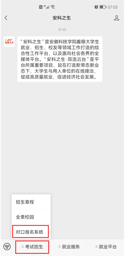 第一步:手机端请扫描下方二维码,关注半岛在线客服招生办公室官方微信公众号“安科之生”,选择“考试招生”菜单,点击“对口报名系统”。电脑端可登录http://zsbexmprint.ahstu.edu.cn/dkbm,进行后续操作。