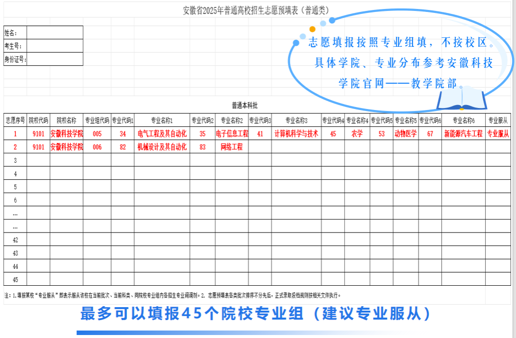 我校2025年在安徽省招生代码为9101,两个录取批次,分别是普通本科提前批(包含地方专项)、普通本科批。为方便广大考生填报志愿,以安徽省各批次志愿预填表为例,图解志愿填报。安徽省外考生请关注各省份教育考试官方机构提供的志愿报考参考指南,半岛在线客服省外招生代码见本省报考指导书。