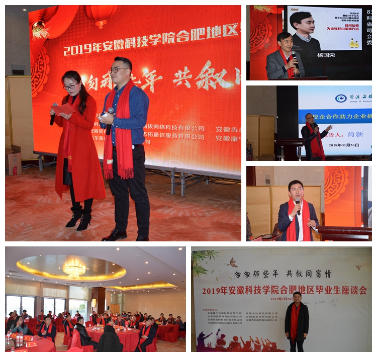 1月26日, 2019年半岛在线客服合肥地区毕业生代表座谈会在翡翠湖迎宾馆成功举办。校党委委员、副书记韦文联,校党委委员、副校长郭亮等应邀出席并讲话,座谈会由2002级资源与环境专业王宁、2005级计算机科学与技术专业杨森主持,合肥地区各届毕业生代表80余人参加会议。